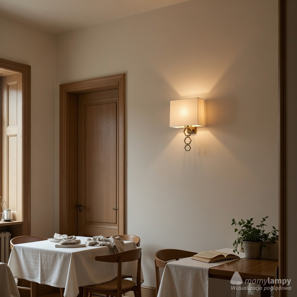 Kluczową cechą kinkietu Ria jest jego półprostokątny klosz, który został wykonany z imitacji jedwabiu. Tkanina w delikatnym kolorze kości słoniowej doskonale rozprasza światło, tworząc przyjemną atmosferę pełną ciepła i spokoju. Jest to idealne rozwiązanie do eleganckich salonów, wysmakowanych sypialni, a także do kameralnych korytarzy, gdzie atmosfera odgrywa kluczową rolę.