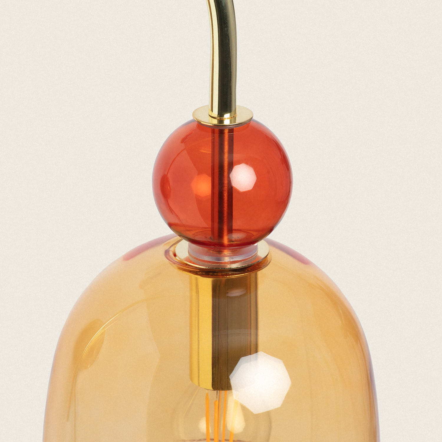 Produkt wykonany został z najwyższej jakości materiałów. Wytrzymałe szkło o bursztynowej barwie nie tylko zachwyca wyglądem, ale także zapewnia równomierne rozproszenie światła. Metalowy zwis lampy wykończony na złoto idealnie kontrastuje ze szkłem, tworząc spójną i elegancką kompozycję.