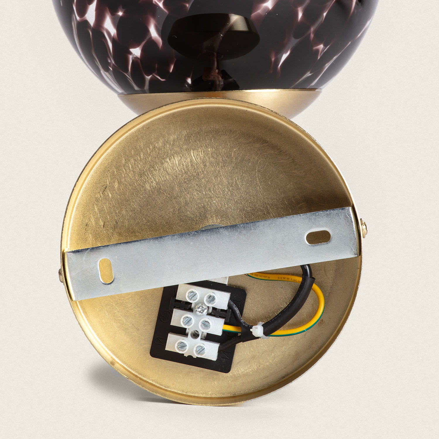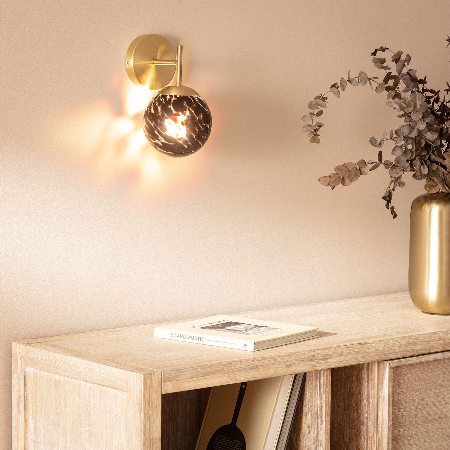 Konstrukcja kinkietu "Sfero Abruzzo" składa się głównie ze szkła o matowym wykończeniu, zapewniającym równomierne rozproszenie światła. Złote detale takie jak ramka kulki czy uchwyt podkreślają jego luksusowy charakter i dodają wnętrzom szlachetności.