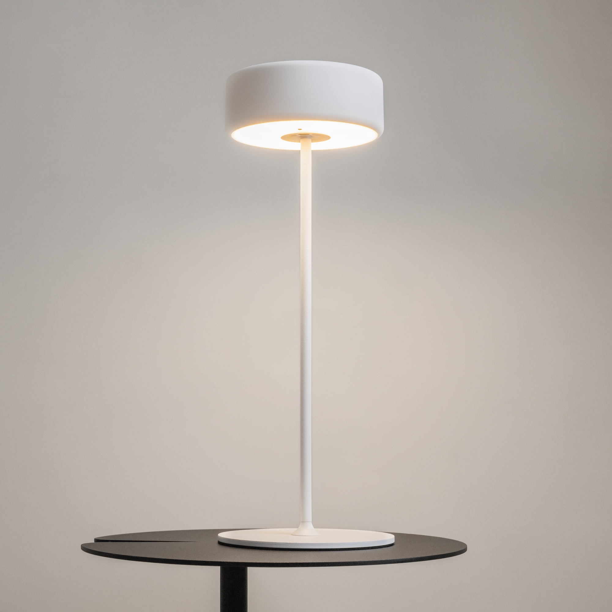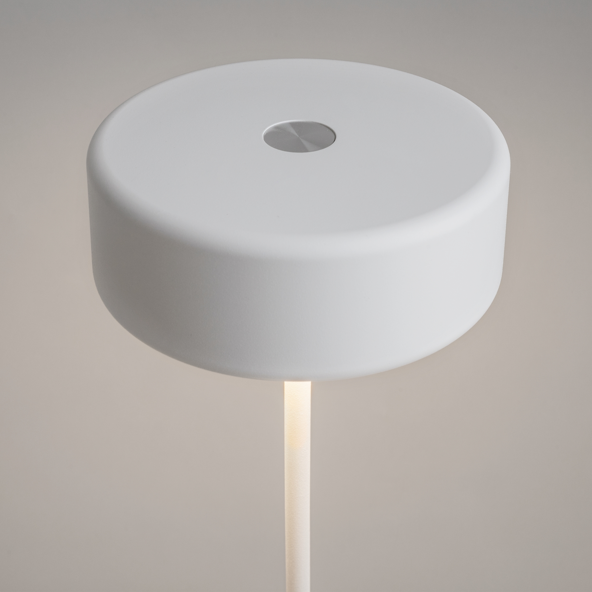 Jej konstrukcja wykonana jest z wysokiej jakości aluminium, co zapewnia trwałość i solidność na lata użytkowania. Dwukolorowe wykończenie w odcieniach białego podkreśla jej nowoczesny charakter i umożliwia łatwe dopasowanie do różnych stylów aranżacyjnych. Lampa charakteryzuje się kompaktowymi wymiarami: wysokość 34,5 cm, średnica podstawy 12 cm i średnica klosza 10,9 cm. Dzięki temu znajdzie swoje miejsce nawet na niewielkich powierzchniach.