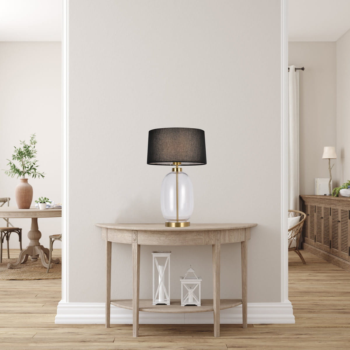 Ta elegancka lampa o wysokości 65 cm została zaprojektowana z myślą o wysokiej funkcjonalności i estetyce. Konstrukcja oparta na przezroczystym szkle oraz metalu z dodatkami złota tworzy wyjątkowe połączenie materiałów. Dzięki temu produkt jest nie tylko trwały, ale również odporny na codzienne użytkowanie. Czarna tkanina klosza subtelnie kontrastuje ze złotymi akcentami, nadając lampie unikalny wygląd.