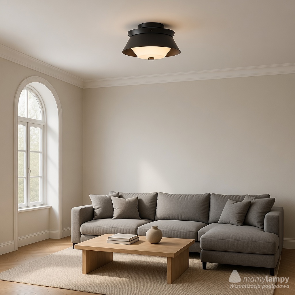 Plafon Bowtie posiada kompaktowe wymiary – ma jedynie 10,2 cm wysokości i 25,4 cm średnicy. To sprawia, że jest idealnym rozwiązaniem zarówno dla większych przestrzeni, jak i mniejszych pomieszczeń, gdzie subtelna obecność plafonu nie przytłoczy wnętrza. Stosowanie żarówek na gwint E14 o maksymalnej mocy 40 W zapewnia mocne, ale nienachalne światło.