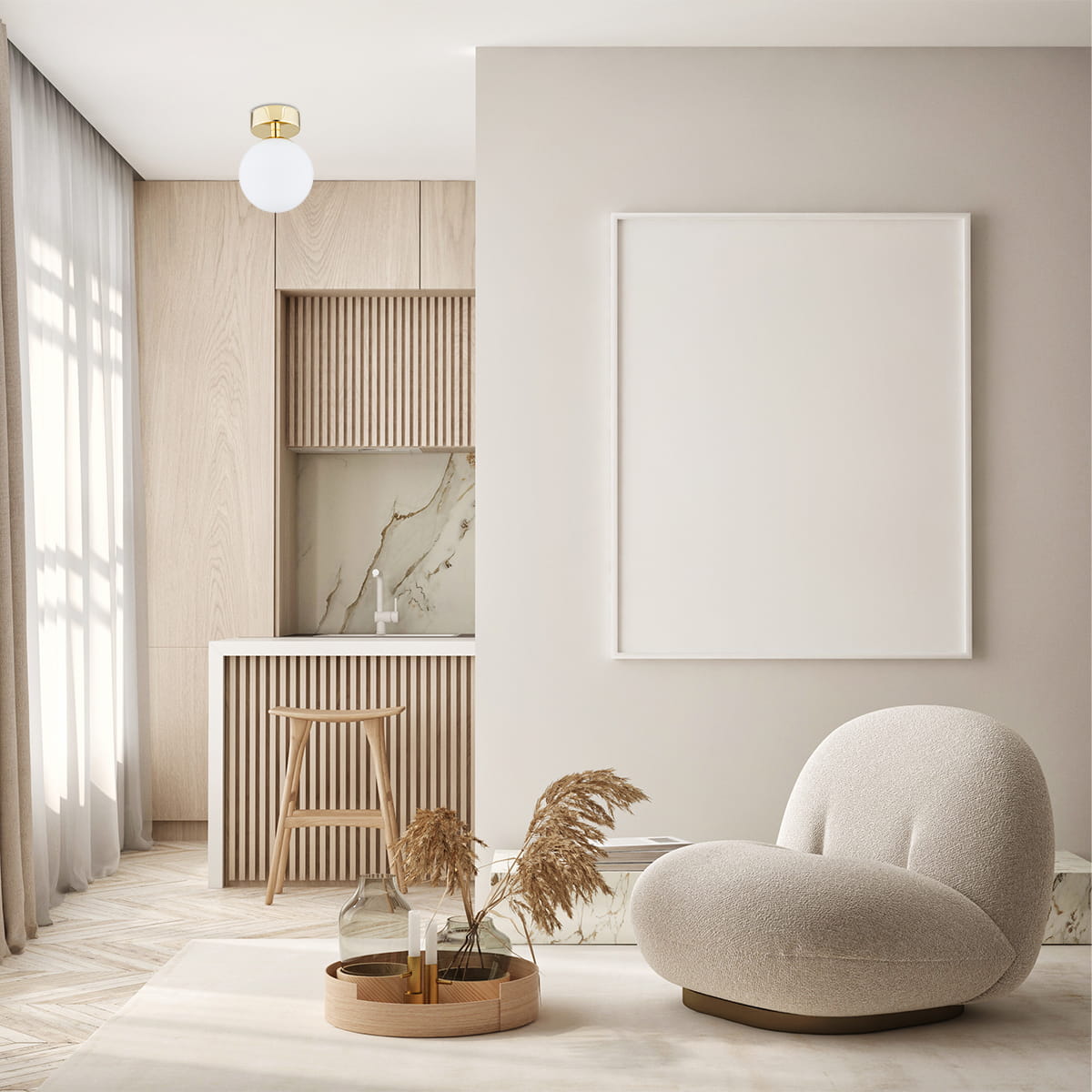 Flavio Argon to połączenie stali mosiądzowanej i szkła opalowego, które tworzą spójną i harmonijną całość. Mosiężna rama prezentuje się niczym dzieło sztuki, a matowe klosze z opalowego szkła rozpraszają światło, delikatnie muskając wnętrze jasnością. To, co przyciąga wzrok, to misternie wykończone detale, które stanowią esencję stylowej prostoty.