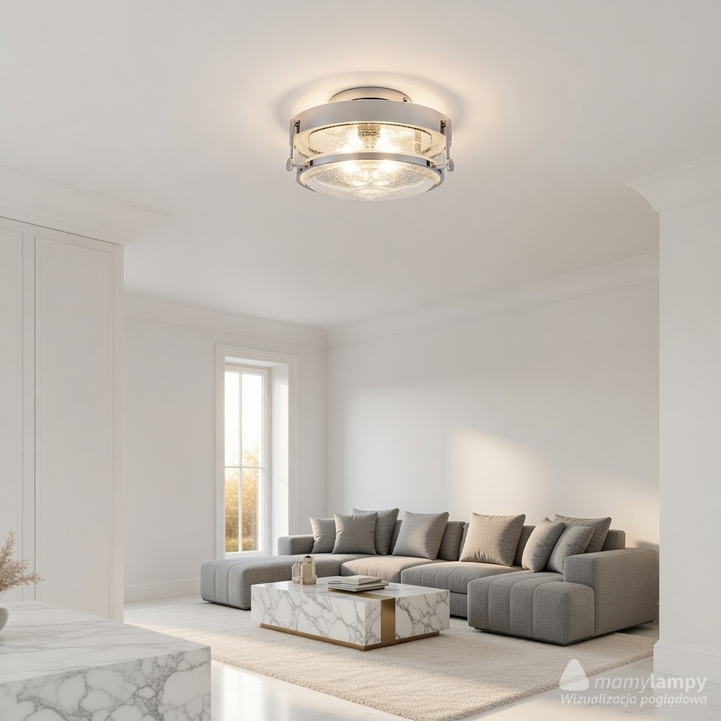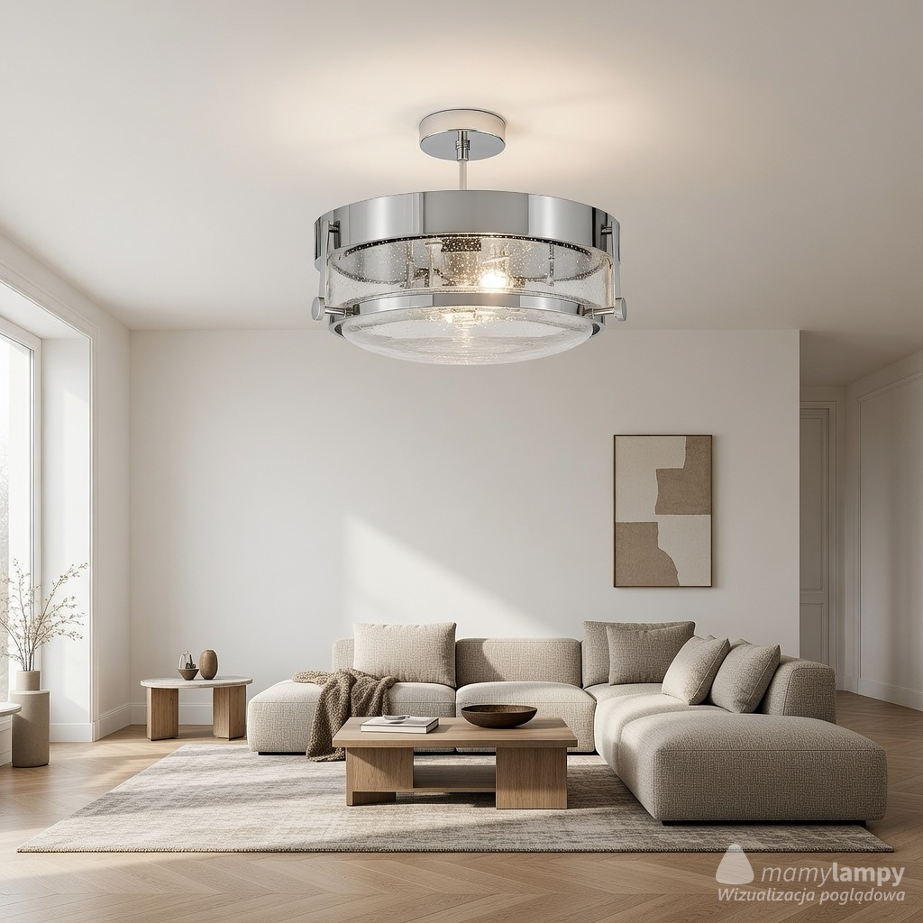 Wysokiej jakości stal i unikalne szklane elementy z bąbelkami powietrza tworzą spójną całość, która nie tylko wygląda niesamowicie, ale także zapewnia trwałość przez lata. Z regulowanym źródłem światła typu E27 i mocą aż do 60 W, plafon dostarcza nie tylko doskonałe oświetlenie, ale i szerokie możliwości personalizacji. Harmonizuje z różnymi stylami wnętrzarskimi, od klasycznych salonów po nowoczesne sypialnie. Kompatybilność z żarówkami ściemnialnymi pozwala na dostosowanie atmosfery pomieszczenia do Twoich potrzeb.