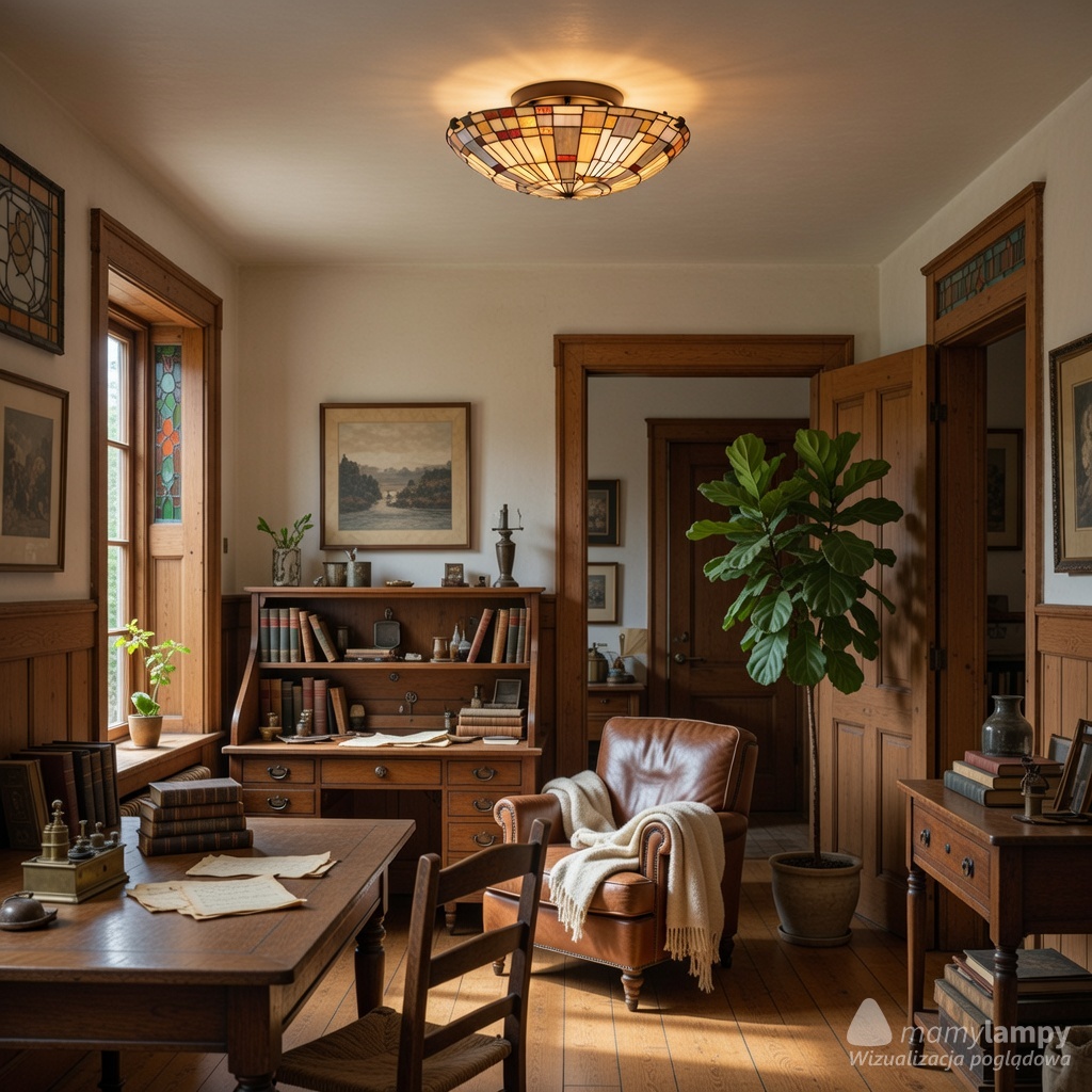 Projekt lampy czerpie inspirację z Art Nouveau. Szkło artystyczne w wielokolorowych tonacjach harmonijnie rozprasza światło tworząc niepowtarzalną atmosferę w pomieszczeniu. Warto podkreślić także estetykę wykonania - brązowy kolor oprawy doskonale komponuje się zarówno z tradycyjnymi jak i nowoczesnymi wnętrzami.