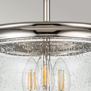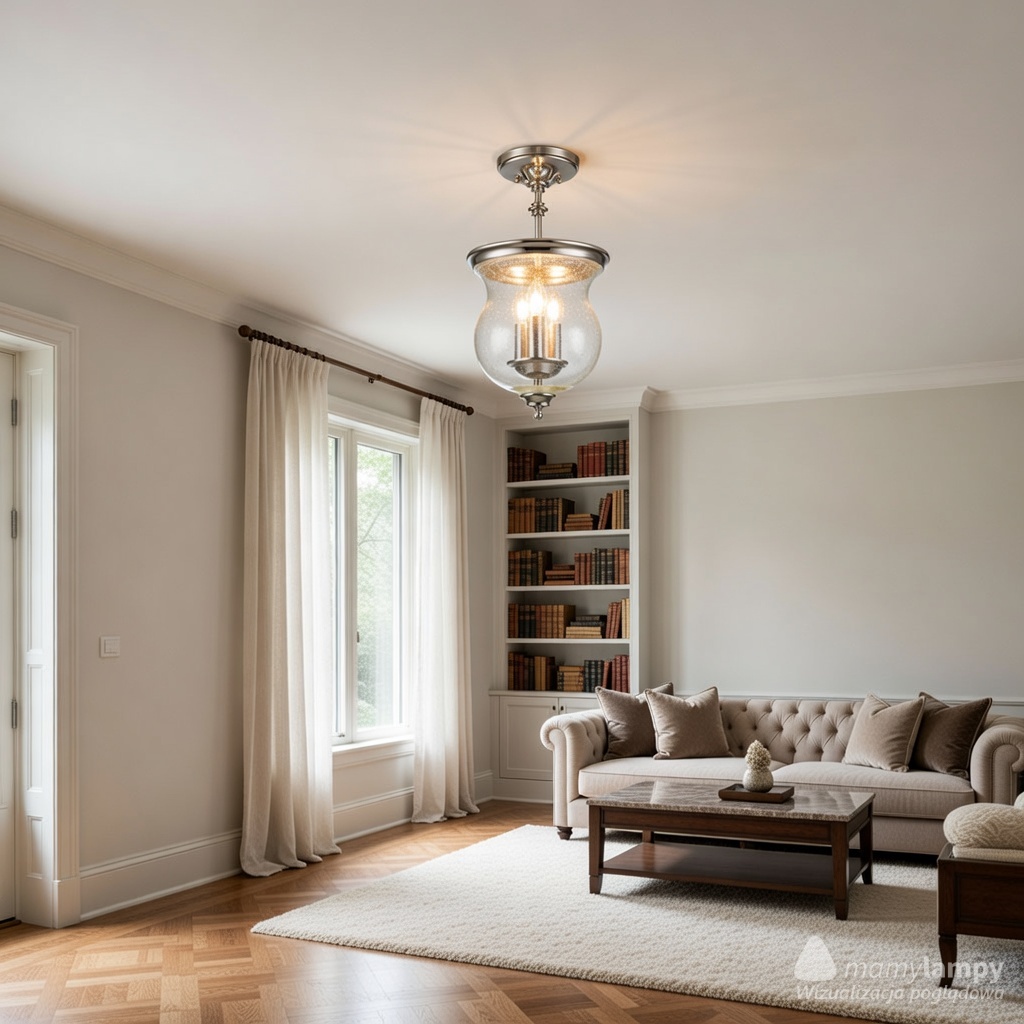 Unikalne klosze wykonane ze szkła z bąbelkami powietrza dodają tej lampie niepowtarzalnego uroku oraz subtelnej lekkości. Ich staranne wykończenie sprawia, że światło jest rozproszone w sposób, który nie tylko tworzy przyjemną atmosferę, ale również optycznie powiększa przestrzeń, nadając jej głębi. Ten model oferuje elastyczność w zastosowaniu - występuje zarówno jako półplafon, jak i w wersji wiszącej dzięki zastosowaniu łańcuchów, co czyni go doskonałym wyborem zarówno do niskich, jak i wysokich pomieszczeń.