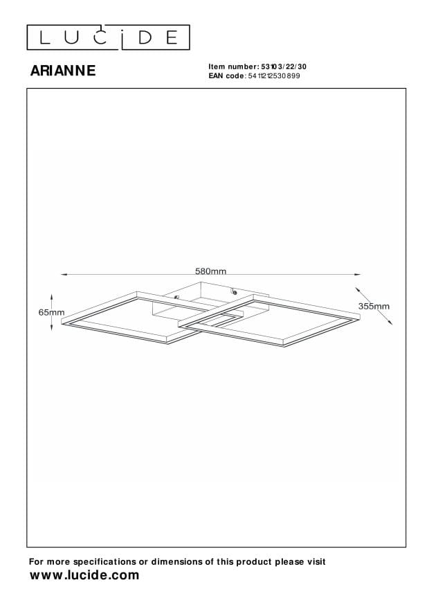 Oprócz estetycznych zalet Lampa sufitowa Arianne Lucide charakteryzuje się praktycznymi wymiarami: długość 41 cm, szerokość 41 cm i wysokość jedynie 7 cm sprawiają, że doskonale nadaje się zarówno do mniejszych jak i większych pomieszczeń. Jej waga wynosi zaledwie 0,97 kg, co ułatwia montaż oraz obsługę.