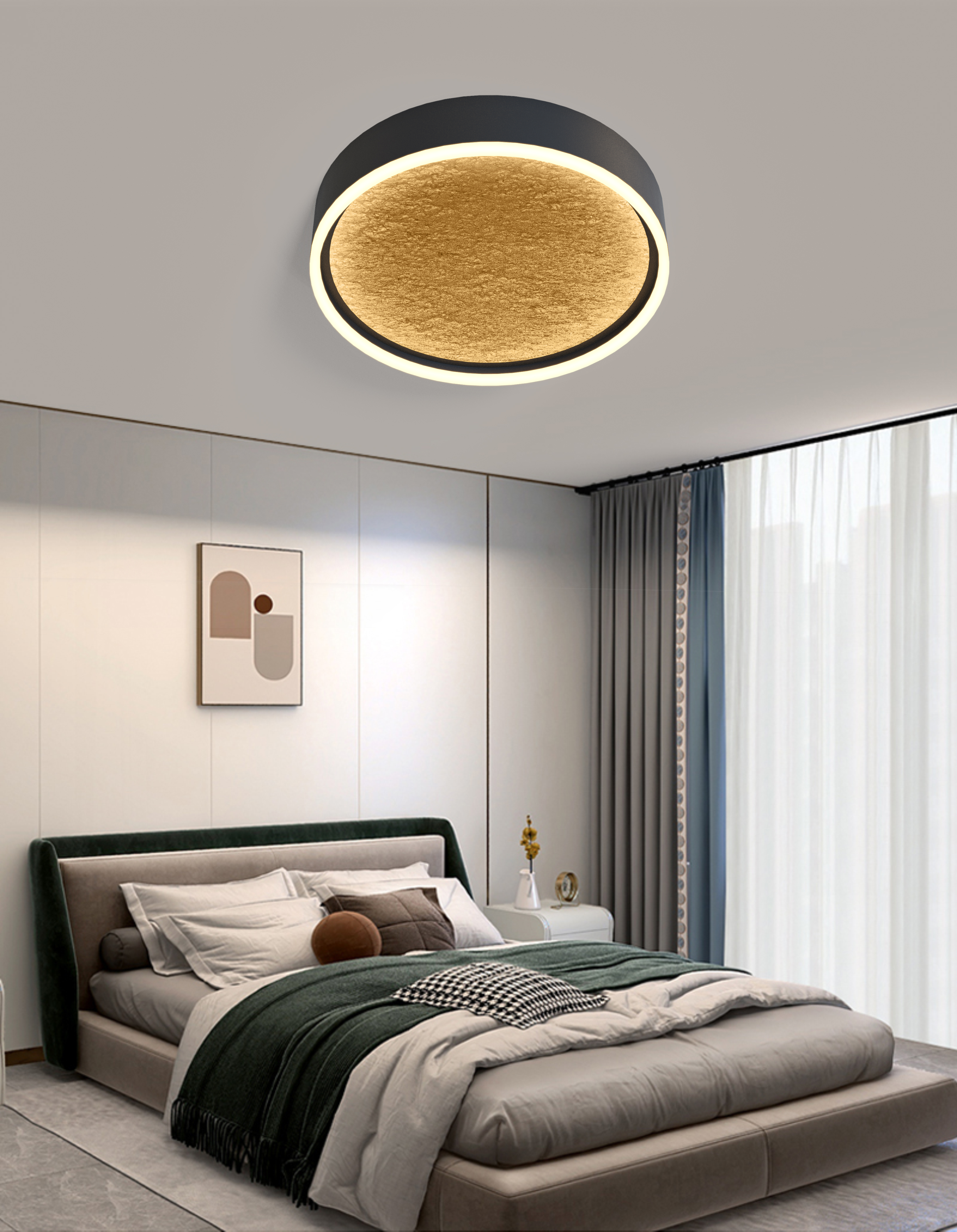 Główną cechą tej lampy jest jej imponujący wygląd, będący rezultatem subtelnego połączenia czarnego matowego metalu z akcentami złotego wykończenia. Średnica wynosząca 40 cm oraz niewielka wysokość zaledwie 8 cm sprawiają, że plafon ten doskonale wkomponuje się w przestrzenie takie jak salon, sypialnia czy jadalnia. Jego klasyczny, a zarazem nowoczesny design czyni go uniwersalnym wyborem pasującym do wielu aranżacji wnętrz.