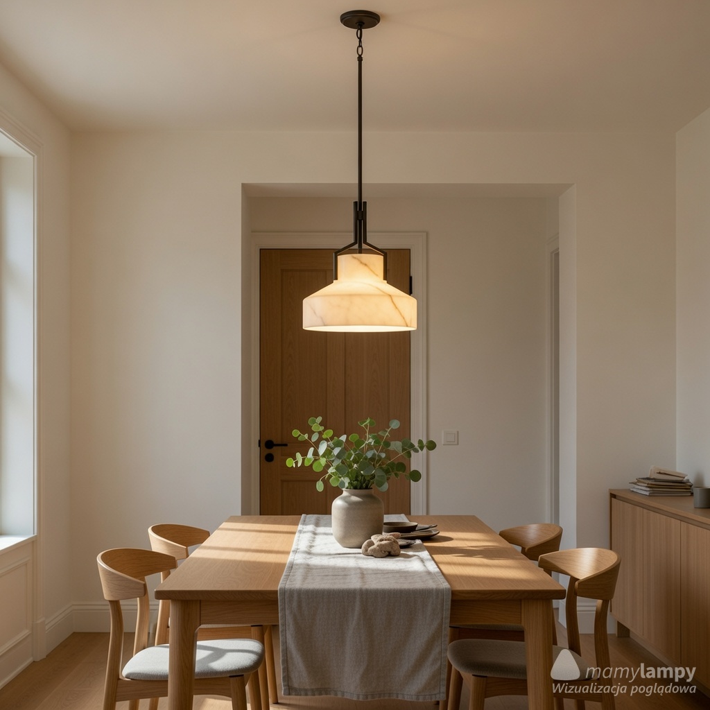 Model ten charakteryzuje się wymiarami: szerokość wynosi 37 cm, a maksymalna długość zawieszenia to aż 143,9 cm. Dzięki temu lampa doskonale sprawdzi się nad stołem lub wyspą kuchenną. Waga lampy wynosi 6 kg, co świadczy o solidności użytych materiałów.