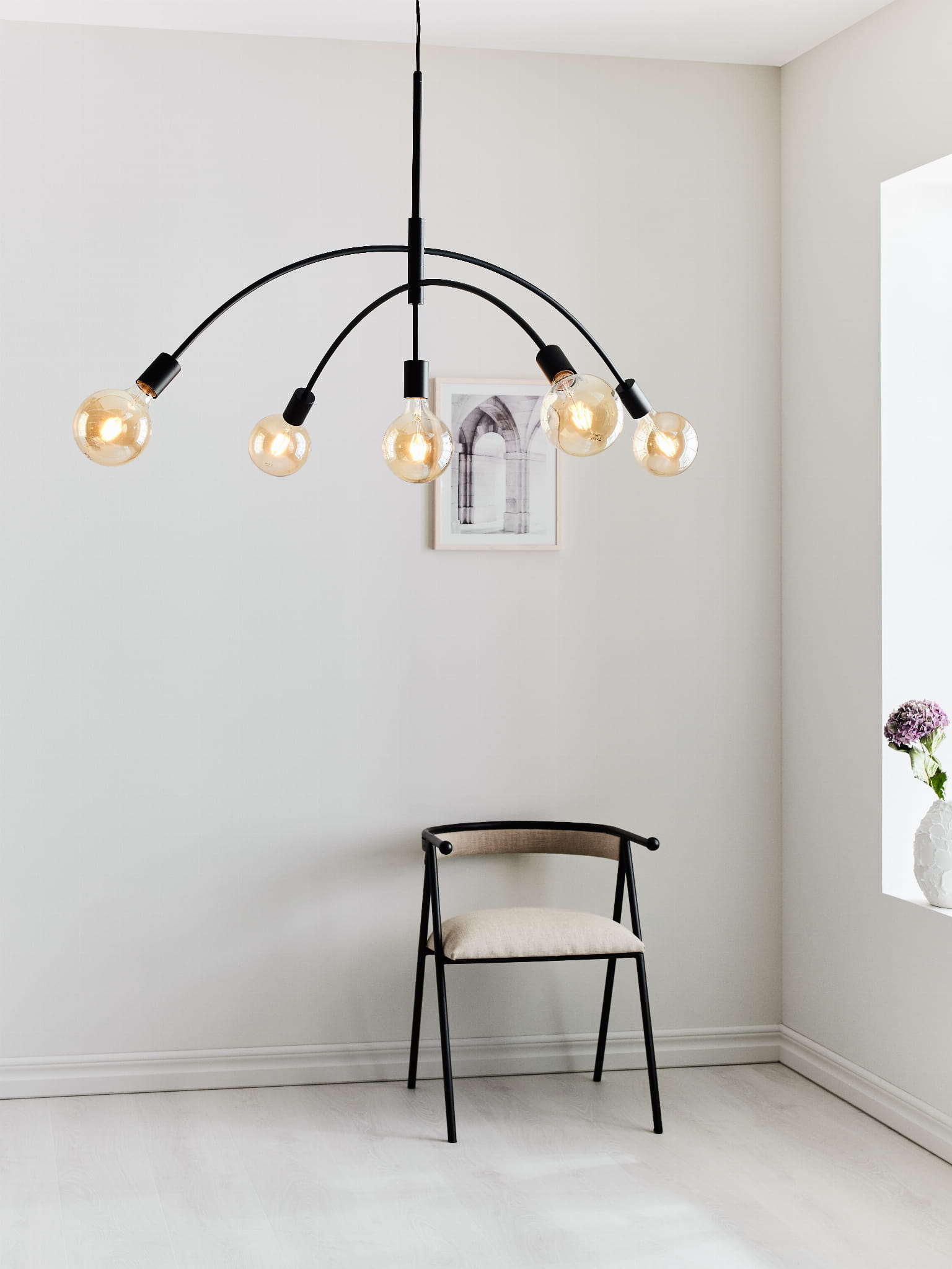 Ta wyjątkowa lampa sufitowa wykonana jest z wysokiej jakości metalu, co zapewnia jej trwałość i odporność na codzienne użytkowanie. Jej konstrukcja ma wysokość regulowaną do 150 cm, co umożliwia dostosowanie jej do różnych wysokości pomieszczeń i indywidualnych potrzeb użytkowników. Wykończona w eleganckiej czerni, harmonijnie komponuje się z wieloma stylami wystroju – od nowoczesnego po industrialny.