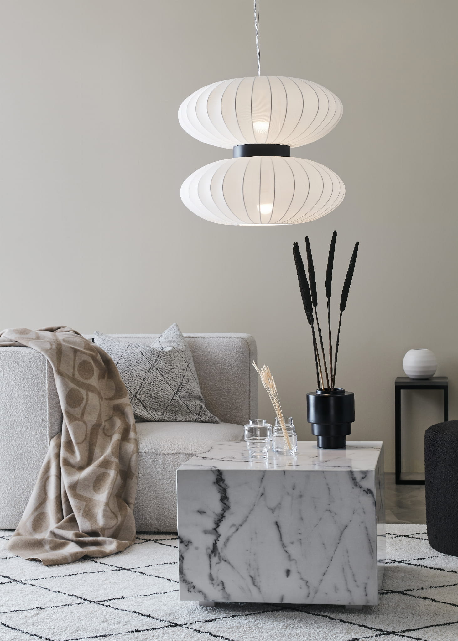 Elegancka forma lampy harmonijnie wpisuje się zarówno w nowoczesne aranżacje wnętrz jak i bardziej klasyczne wystroje. Uniwersalna kolorystyka czerni oraz bieli umożliwia łatwe dopasowanie do istniejącego wystroju wnętrza oraz pozostałych elementów dekoracyjnych.