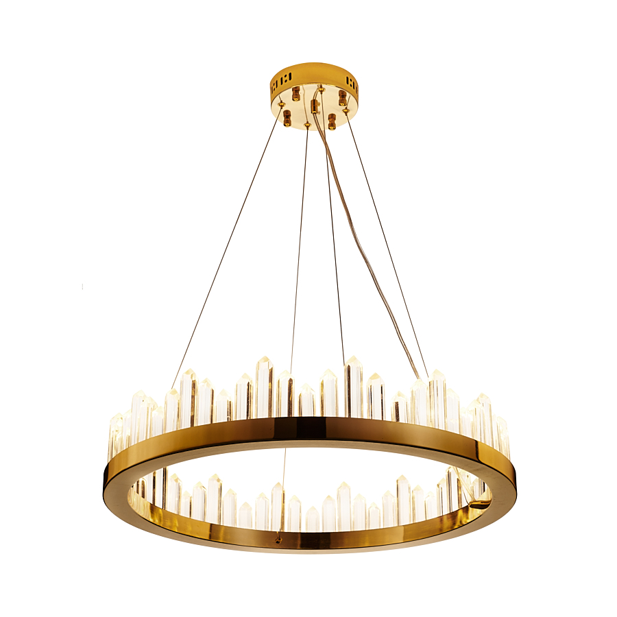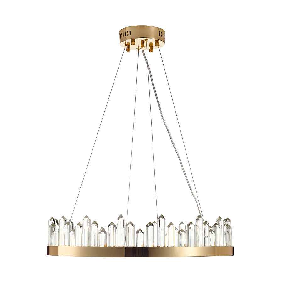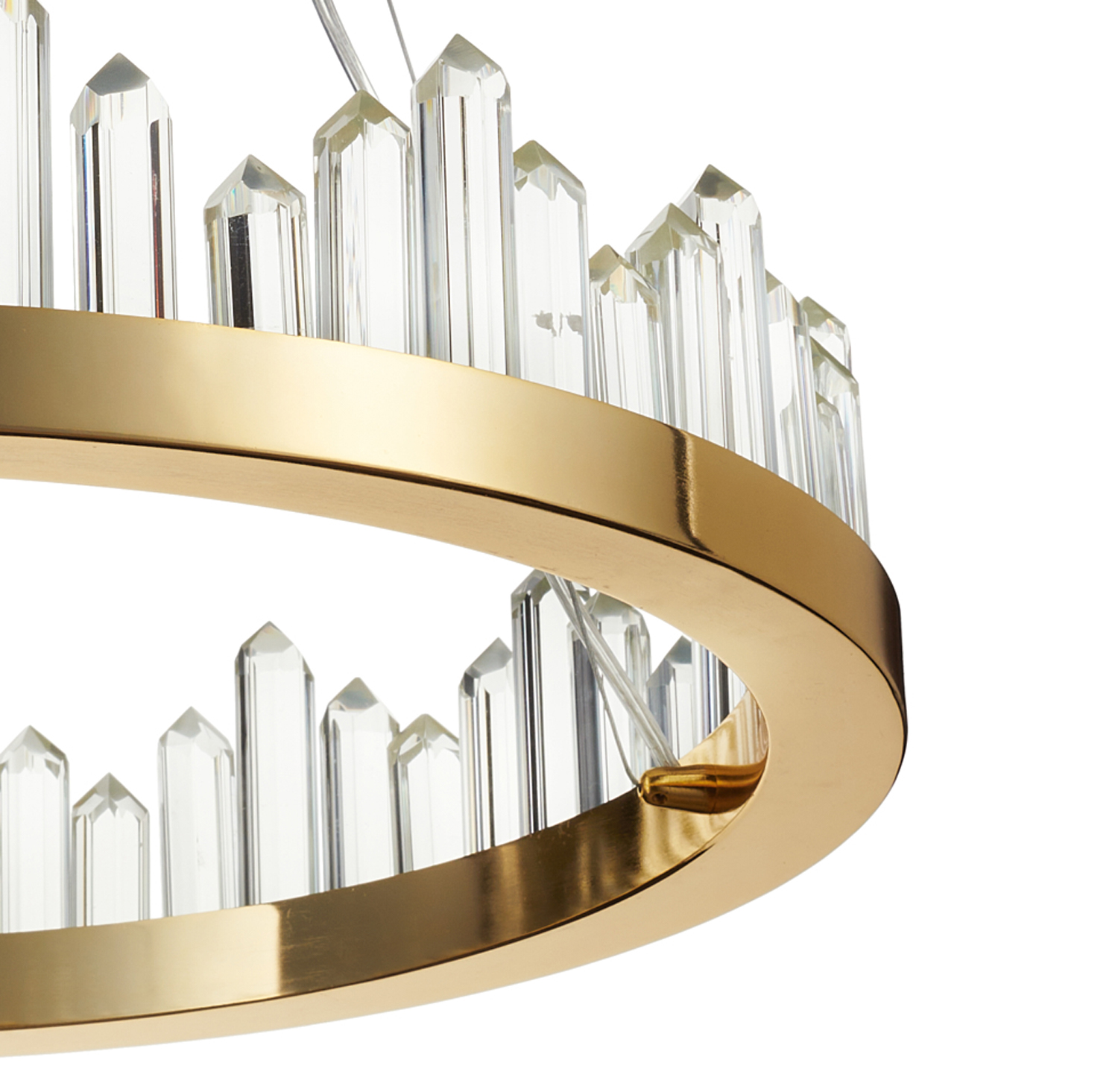 Wykonana z najwyższej jakości materiałów, lampa Lusso wyróżnia się użyciem metalu oraz szkła kryształowego K9, znanego ze swojej wyjątkowej przejrzystości i zdolności do efektywnego rozpraszania światła. Kryształy te podkreślają luksusowy charakter produktu i doskonale komponują się ze złotym wykończeniem oprawy. Dzięki stalowym linkom o regulowanej długości do 200 cm, lampa może być dopasowana do różnych wysokości pomieszczeń, co czyni ją uniwersalnym rozwiązaniem dla wnętrz o zróżnicowanych wymiarach.