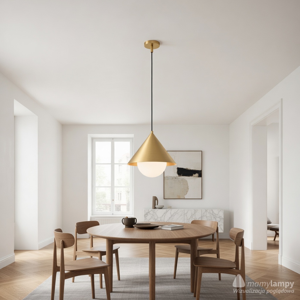 Produkt charakteryzuje się eleganckim designem w złotym kolorze oraz wykonaniem z wysokiej jakości stali i szkła opalowego. Złote wykończenie nadaje lampie luksusowy wygląd, a matowe szkło opalowe równomiernie rozprasza światło, tworząc przyjemną atmosferę w pomieszczeniu. Idealnie komponuje się z różnorodnymi stylami wnętrzarskimi od klasycznych po nowoczesne.