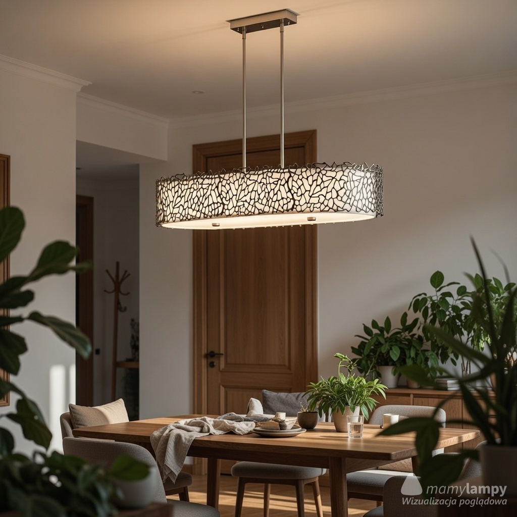 Praktyczność idzie tutaj w parze z estetyką. Lampa ma wymiary (długość/szerokość/wysokość) odpowiednio 86,4 cm / 35 cm / 40,6 cm, co czyni ją idealnym wyborem do większych pomieszczeń, jak salony, jadalnie czy open space. Elastyczna wysokość zawieszenia (od 17,5 cm do 119,4 cm) umożliwia jej idealne dostosowanie do każdej przestrzeni, zapewniając komfort i pełną swobodę aranżacji wnętrza.