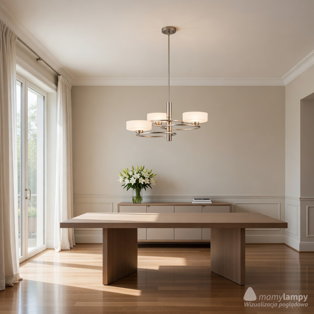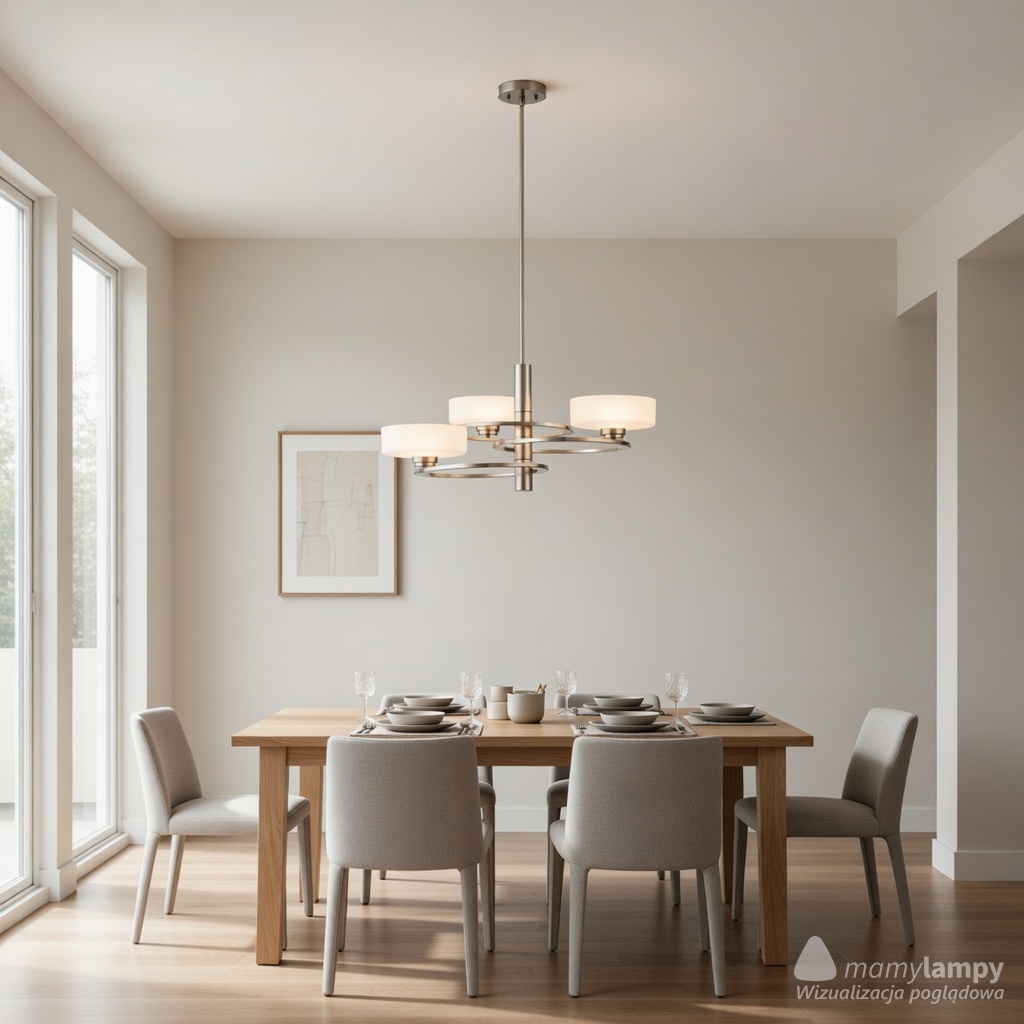 Jednym z kluczowych atutów produktu jest jego designerski, minimalistyczny wygląd, który przyciąga wzrok, ale nie przytłacza. Wznoszące się i opadające łuki w srebrnym odcieniu dodają wnętrzu lekkości, tworząc niebanalny akcent. Konstrukcja lampy umożliwia perfekcyjne wyważenie formy i funkcji, co czyni ją uniwersalnym rozwiązaniem zarówno dla klasycznych, jak i bardziej nowoczesnych aranżacji.