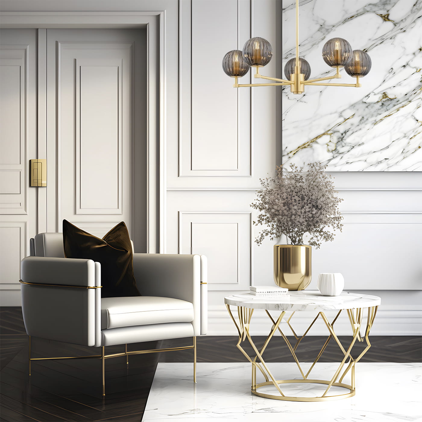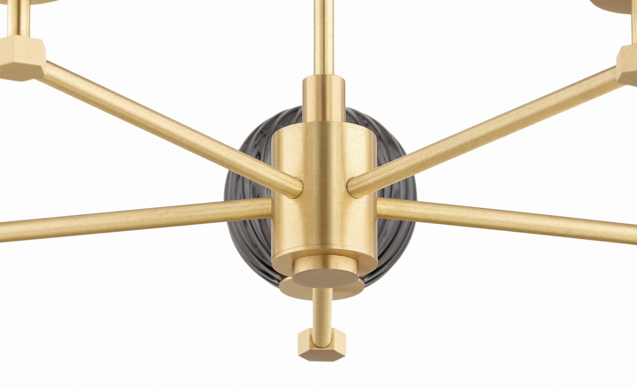 Paloma zachwyca harmonijnym połączeniem materiałów - szkło o dymnym odcieniu oraz szczotkowany mosiądz współgrają niczym doskonale zgrana symfonia, która przyciąga wzrok i uzupełnia każdą aranżację. Dzięki ryflowanej powierzchni szkła światło mieni się jak w kalejdoskopie, tworząc na ścianach subtelne świetlne obrazy. To żyrandol, który nie tylko oświetla, ale i zdobi swoje otoczenie.